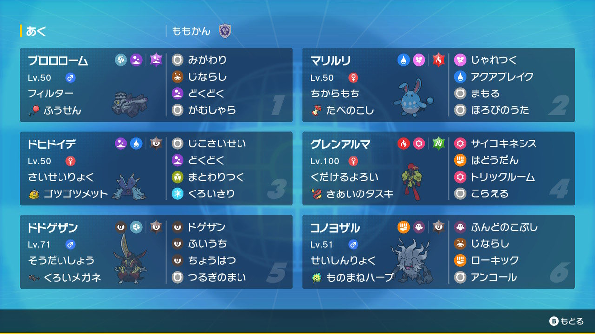 毒毒は「グレンアルマを加速させずに削る」「コノヨザルへの削り」「不意打ち+毒の縛り性能」「高耐久ポケモンに対する崩し性能」を評価して採用したが非常に強力であった。